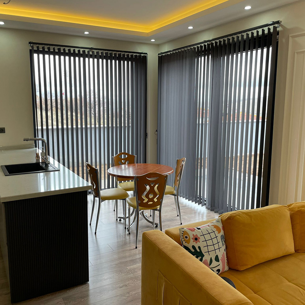 Vertical roller blinds offer ease of use thanks to their ability to open to the left, right, or split to both sides. By rotating the fabric vanes on their own axis, they allow precise control of sunlight, as well as the option to fully open or completely close the space. This ensures optimal privacy and efficient daylight management.