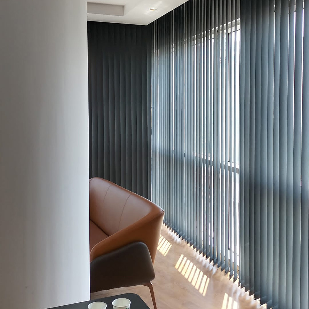 Vertical roller blind systems are designed for heavy use with a robust carrier track mechanism, high-quality chain-and-cord control, and durable fabric construction. Thanks to their easy-to-clean, low-maintenance structure, they are among the most practical window covering solutions for corporate spaces.